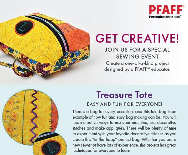 Join us for two days of creative sewing with Karen Charles. Whether you are a Pfaff, Viking or another brand owner, Karen always inspires and informs. This 2 day event will take you on a creative journey while creating a fun project that you can recreate at home. Machines will be provided as needed. Creative Icon 2 owners will bring their machines(and receive a gift in return). Sign up today as space will be limited.